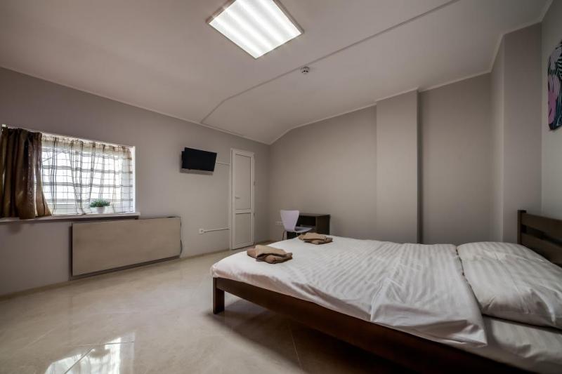 Spacious room with a large double bed and a private bathroom. You will find a coat rack, a table, a chair, a TV, and a fold-out sofa, that you can use as an additional bed.